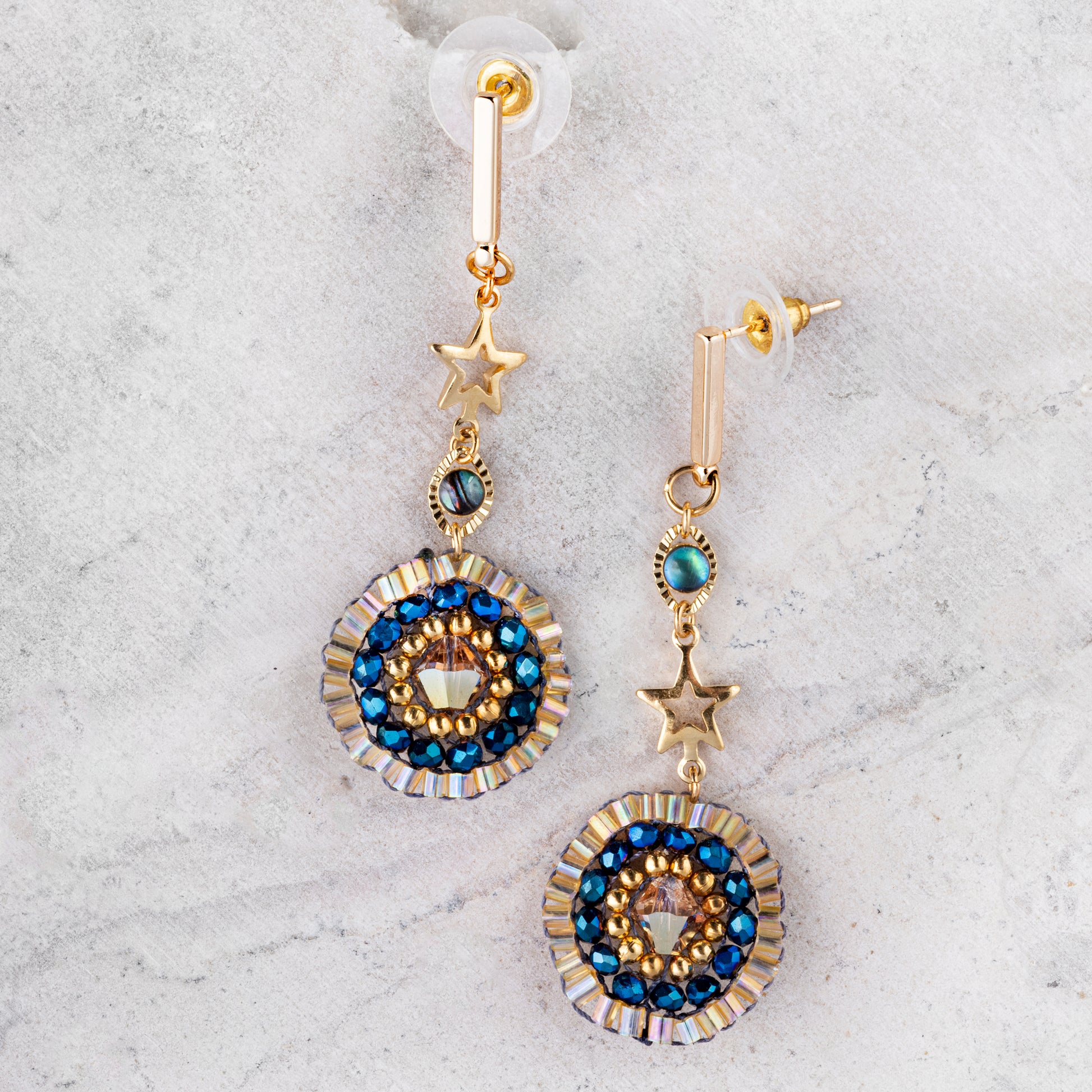 Earrings made by tissues and crystals with a rosette shape a star touch with gold plated.