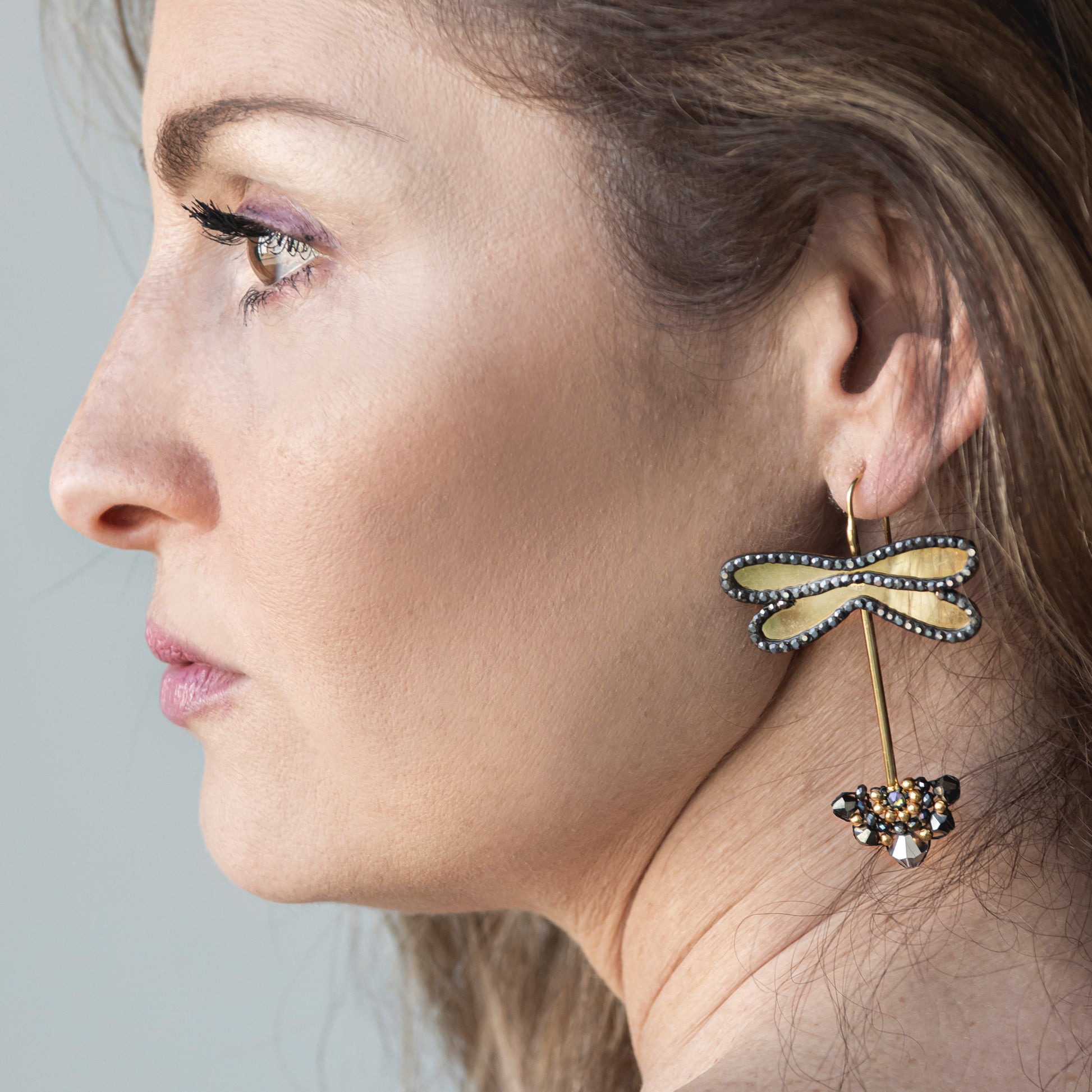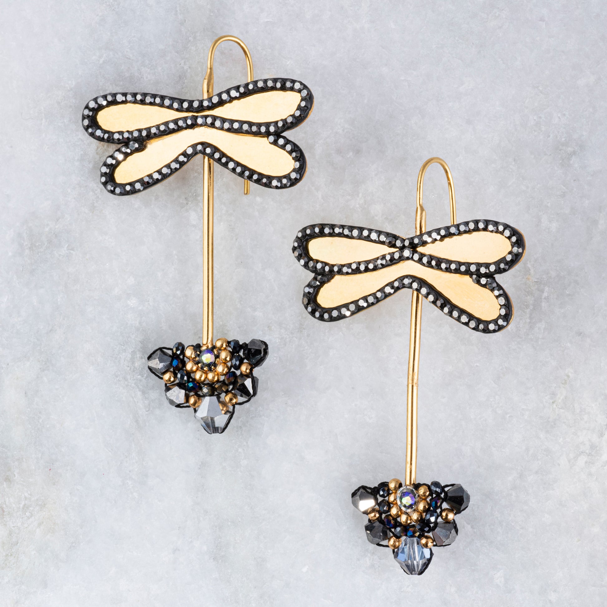 Aretes elaborados de metal con baño de oro con incrustación de cristales.
