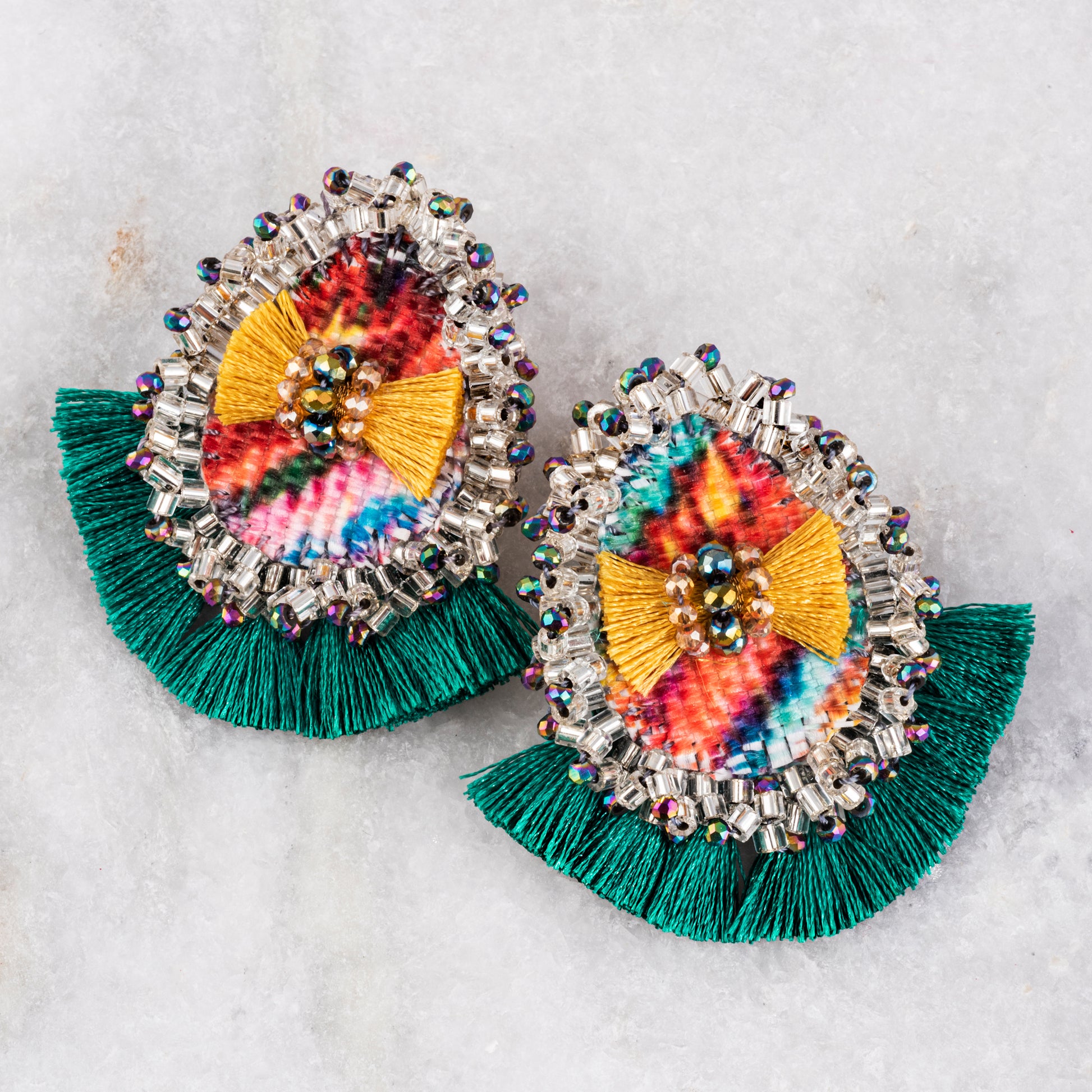 Aretes con tejido típico mexicano y tejido de cristales al rededor de su contorno, barra de metal con baño de oro.