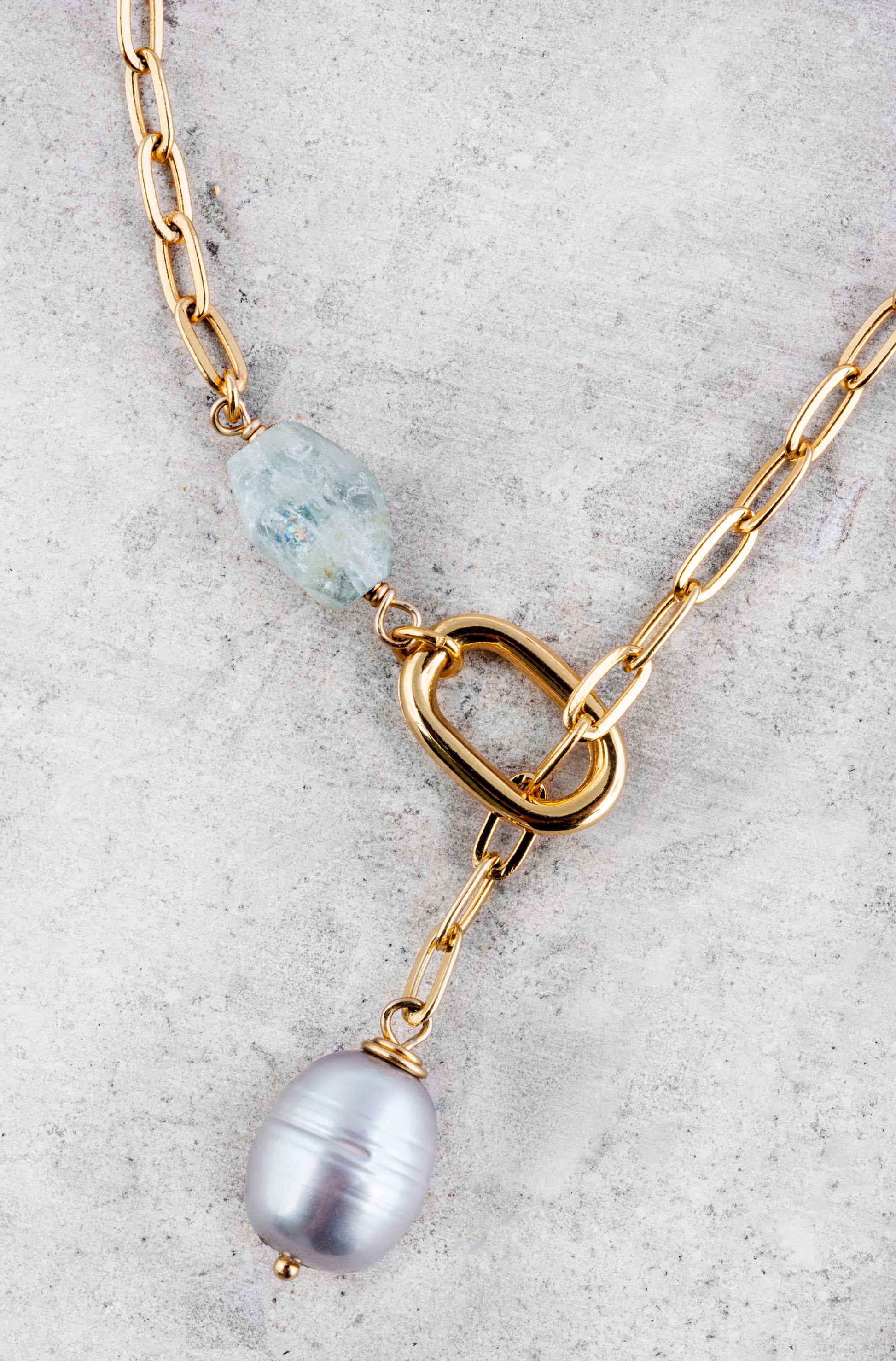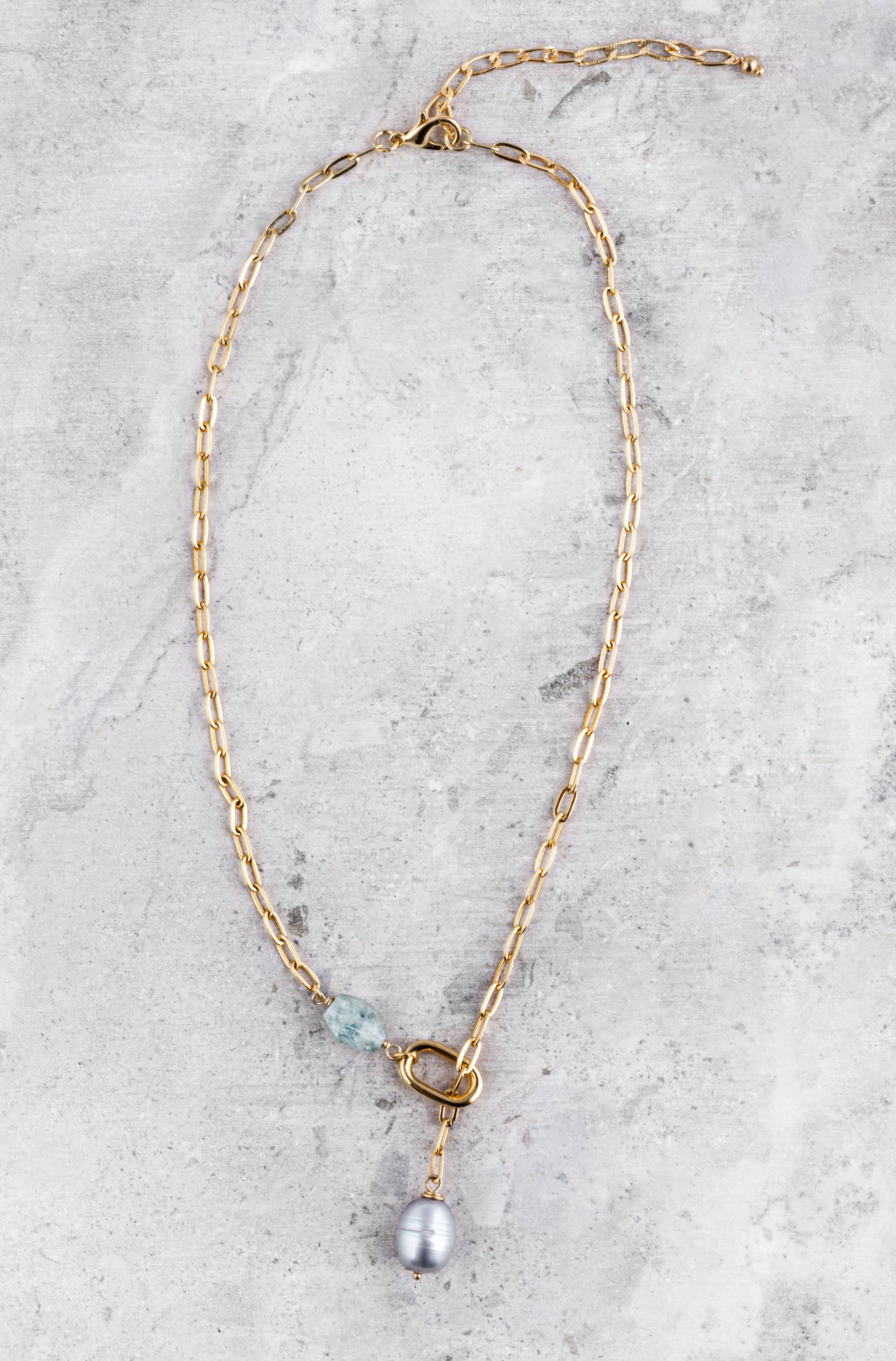 Cadena de metal con baño de oro, dije de madre perla y piedra natural.