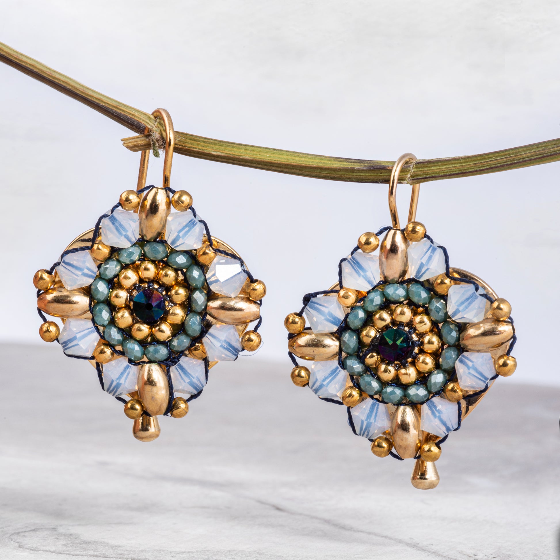 Aretes elaborados a base de hilos con un toque de metal y baño de oro con cristales tejidos para dar la forma al arete.