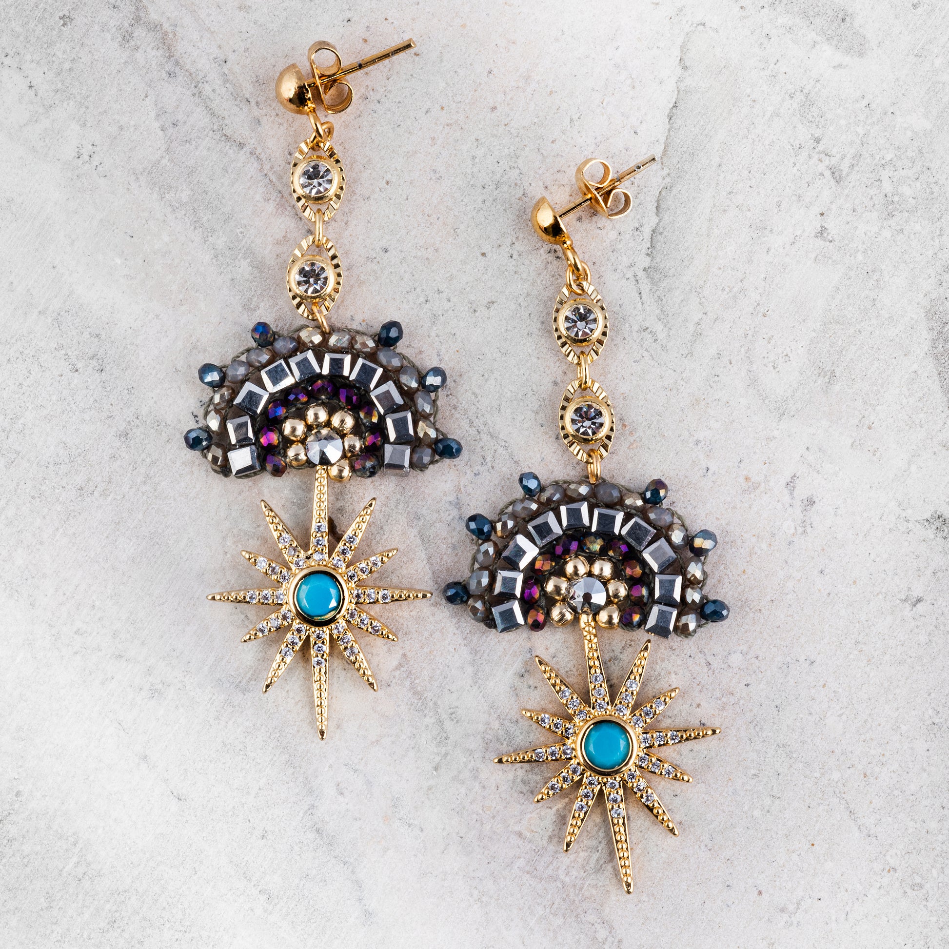 Aretes con base de metal con baño de oro e incrustación de cristales.