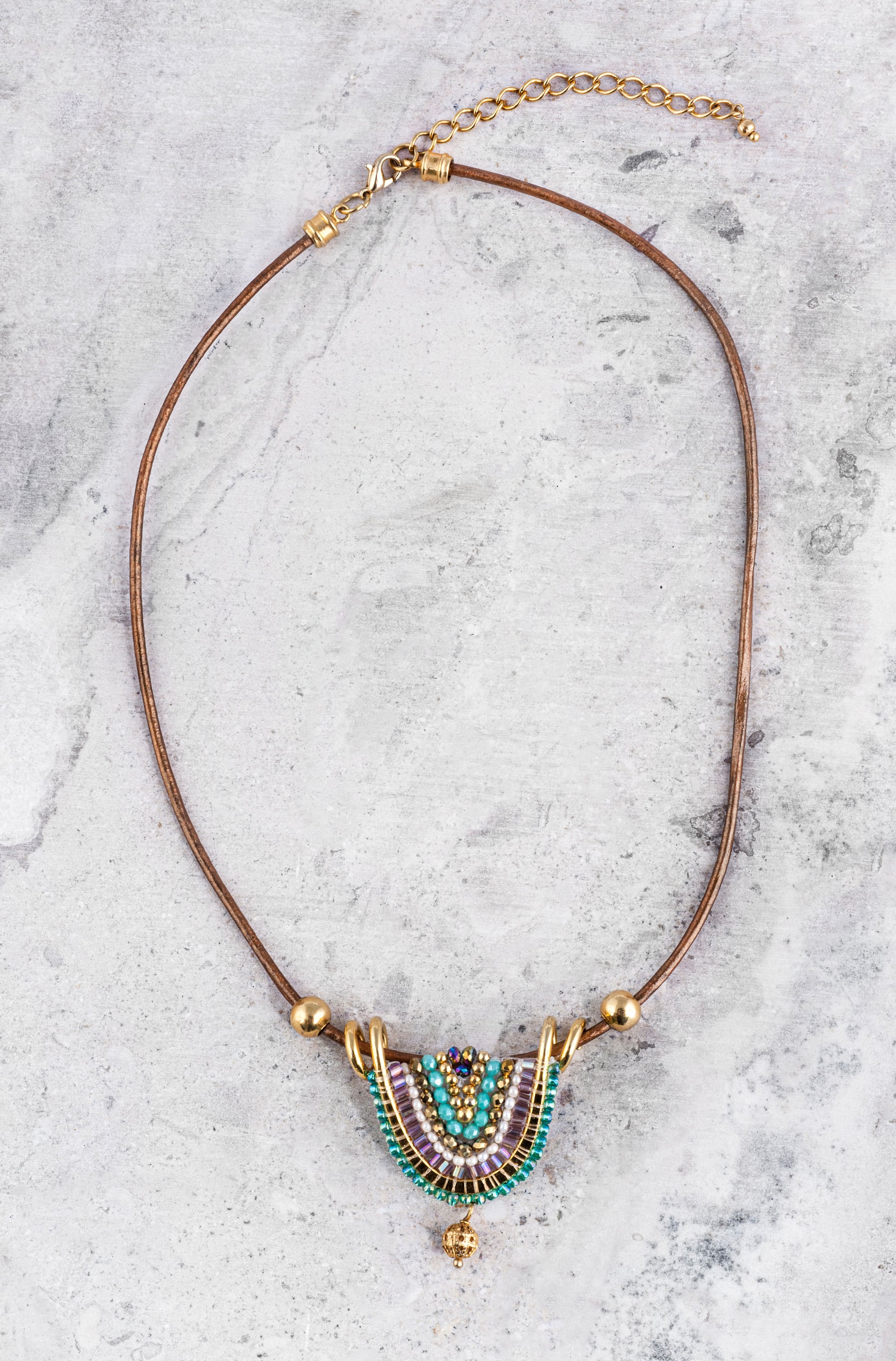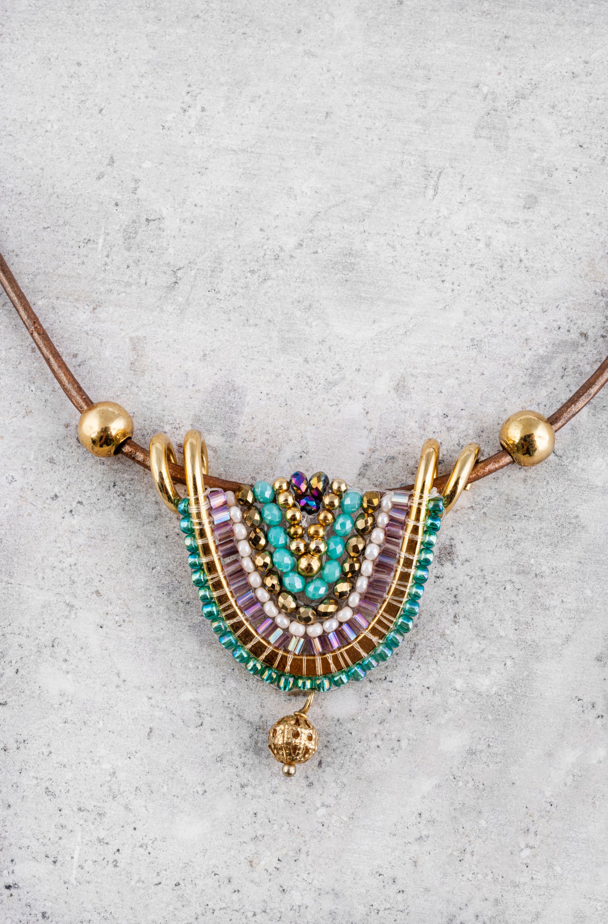 Cordón con dije elaborado con cristales y detalles de metal con baño de oro.