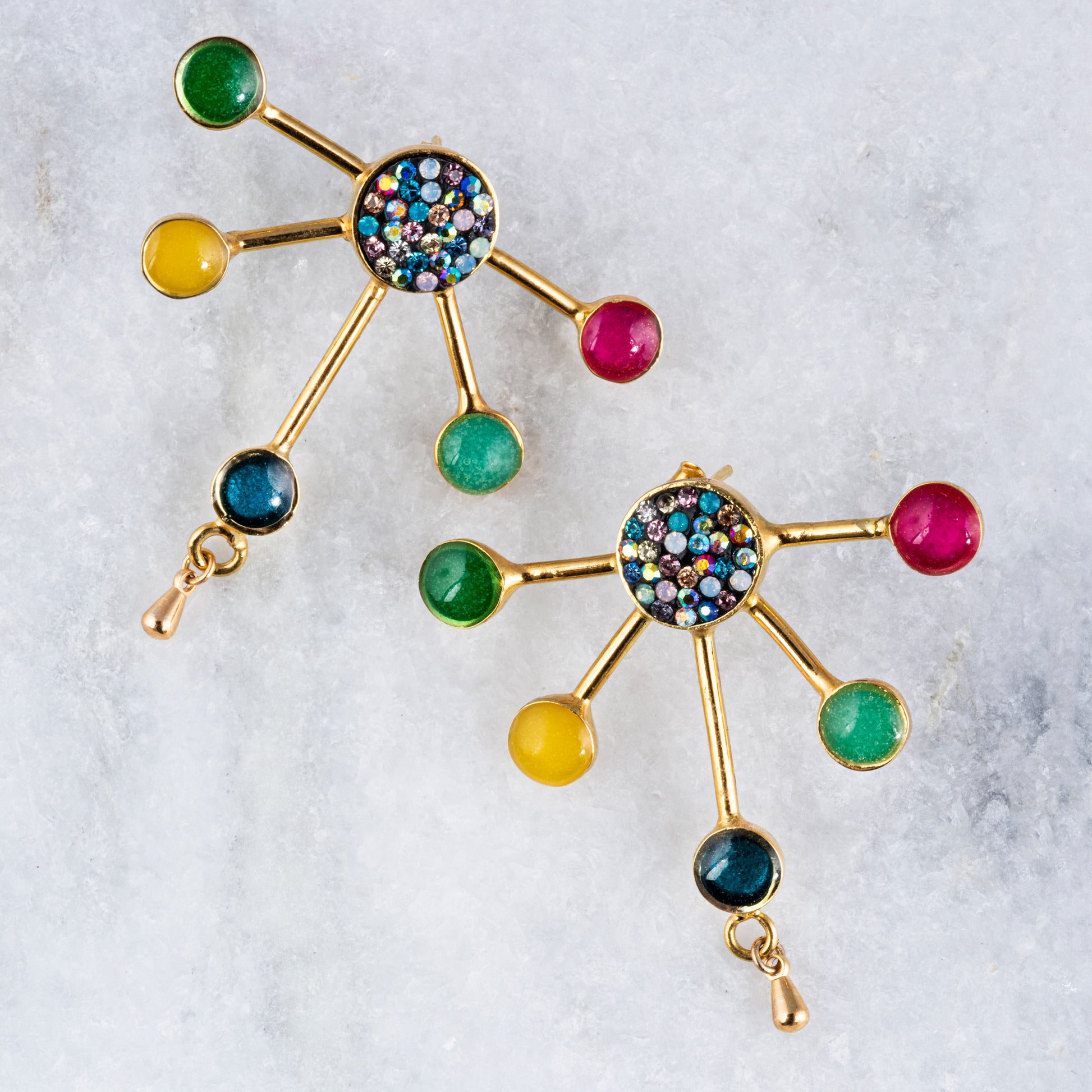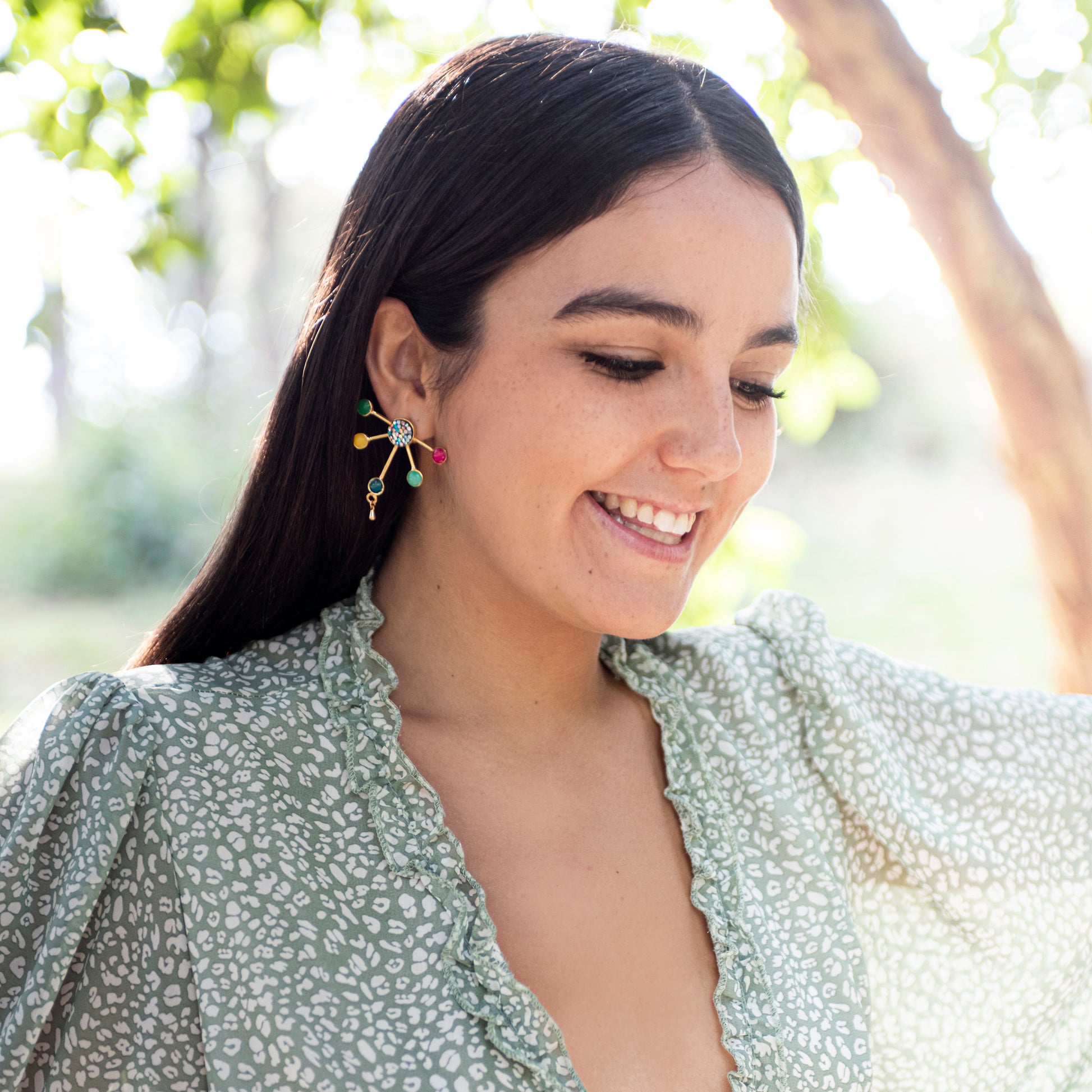 Aretes elaborados de metal con baño de oro con incrustación de cristales.